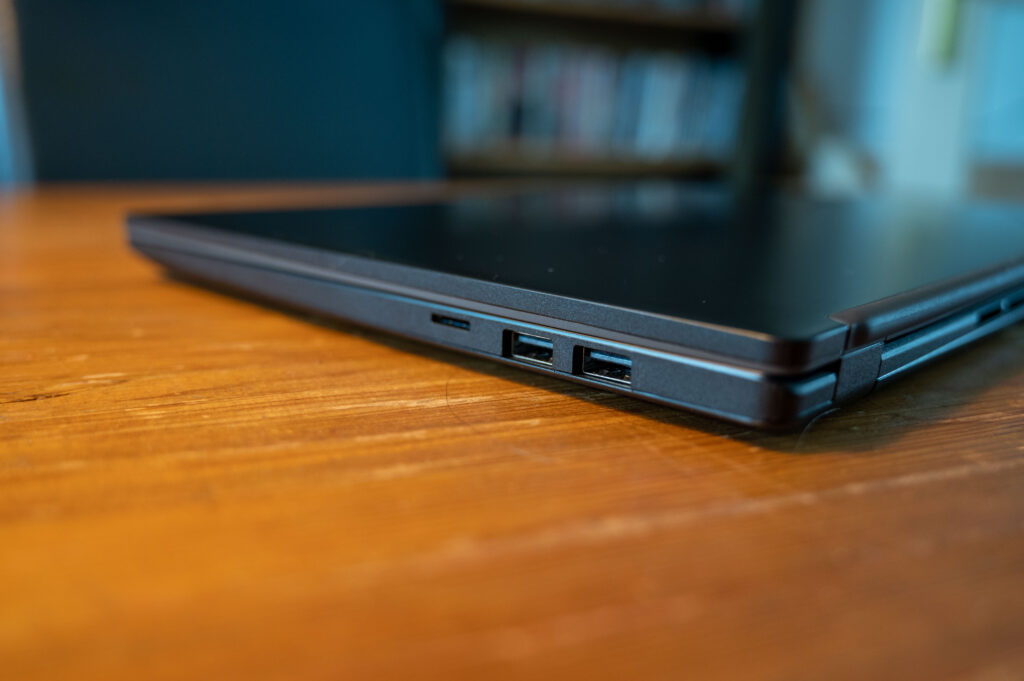 De laptop heeft ook een goede selectie poorten, waaronder USB 3.2 Gen 1 Type-A en USB 3.2 Gen 2 Type-C-poorten, een HDMI-poort en een microSD-kaartlezer. Dit biedt een behoorlijk aantal connectiviteitsopties, zodat je, indien nodig, eenvoudig randapparatuur en externe beeldschermen kunt aansluiten.